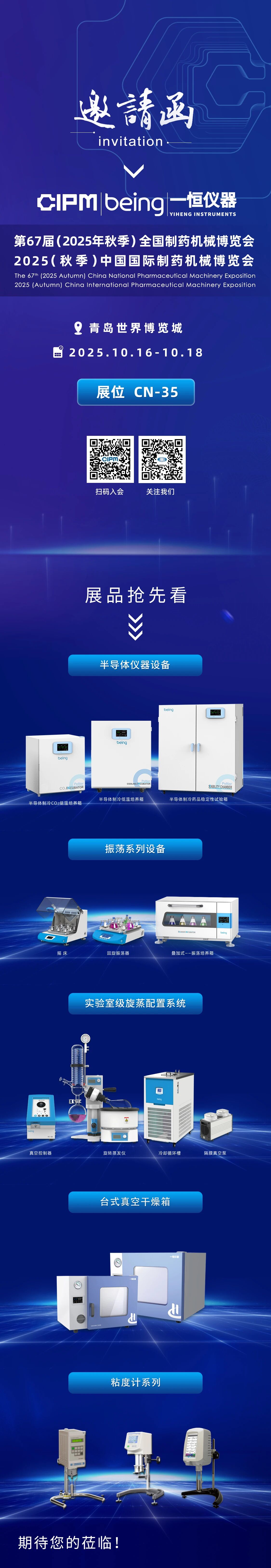 2025-10-13 | 文章來源: | 點(diǎn)擊率: 2025年(秋季)中國國際制藥機(jī)械博覽會將于2025年10月16日在青島世界博覽城開幕,我們誠摯邀請您蒞臨CN-35展位,共話合作新機(jī)遇。作為溫濕度控制解決方案的專業(yè)供應(yīng)商,我司將攜半導(dǎo)體制冷系列設(shè)備、振蕩系列設(shè)備、實(shí)驗(yàn)室旋轉(zhuǎn)蒸發(fā)儀配置系統(tǒng)、干燥箱系列、新型粘度計與專業(yè)解決方案亮相展位CN-35。